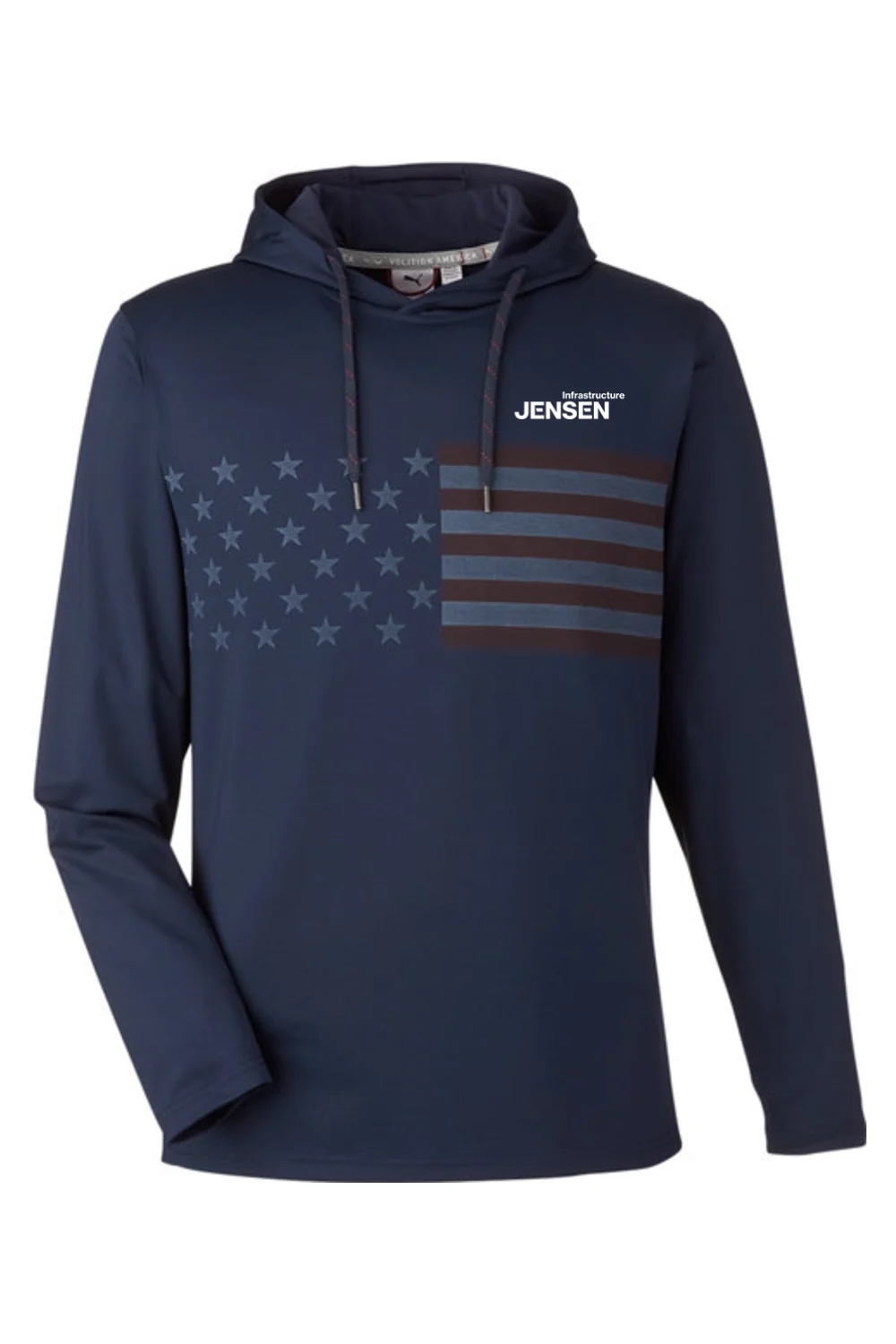 Stay sharp and comfortable with the Puma Golf Men’s Volition Patriotic Hooded Pullover. Featuring moisture-wicking fabric and UV protection, it keeps you dry while showcasing your patriotic pride. It includes a DTF logo on the left chest. Made with eco-friendly, Bluesign-certified materials, this pullover supports military families through the Folds of Honor Foundation. Stylish, responsible, and high-performance—elevate your game with purpose.