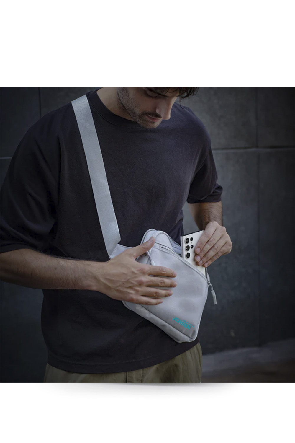 Reflective safety details on the front pocket and shoulder strap