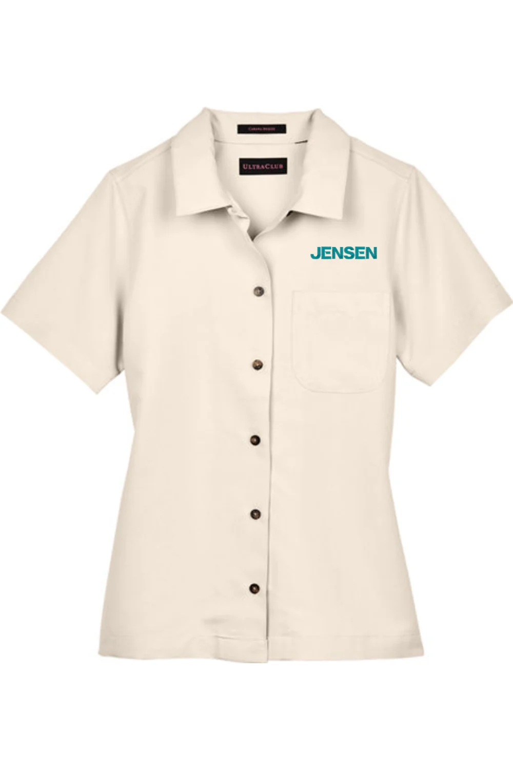 Relaxed, breezy, and perfect for warm weather—this camp-style shirt offers effortless comfort with a smooth, sand-washed finish. Its comfort fit, square bottom, and side vents make it ideal for casual outings, resort settings, or laid-back workdays. Decorated with the Jensen logo embroidered on the left chest.