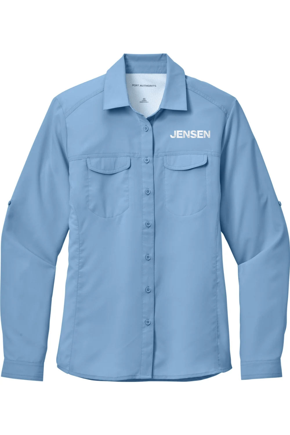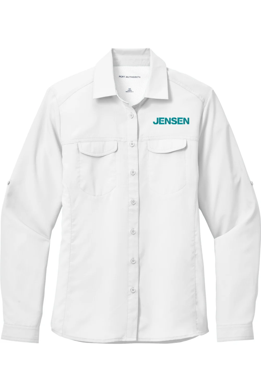 Features include roll-up sleeves with button tabs, chest pockets with hidden closures, and a vented mesh back panel for extra airflow. The relaxed fit and rounded hem offer ease and comfort wherever the day takes you. Decorated with the Jensen logo embroidered on the left chest.