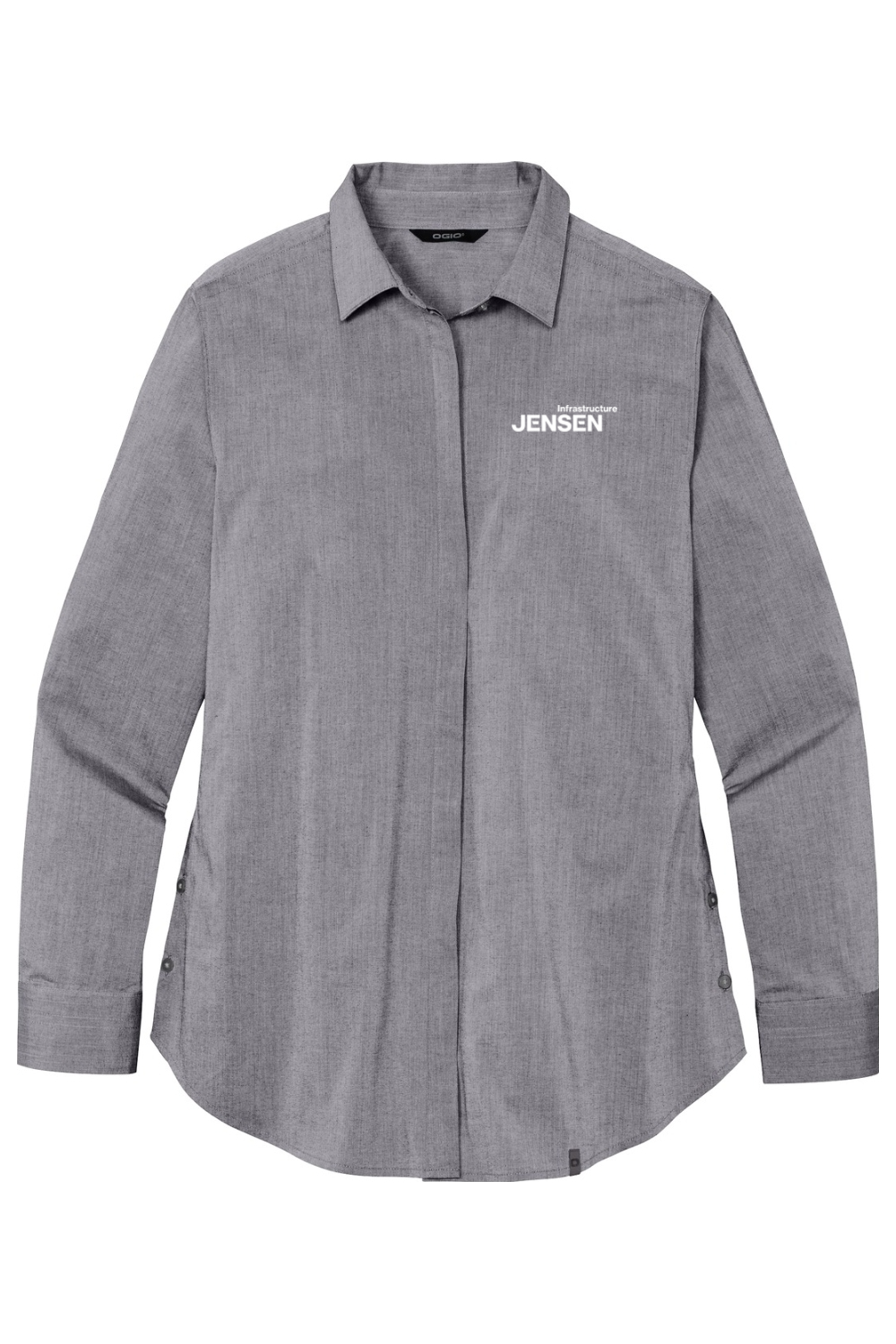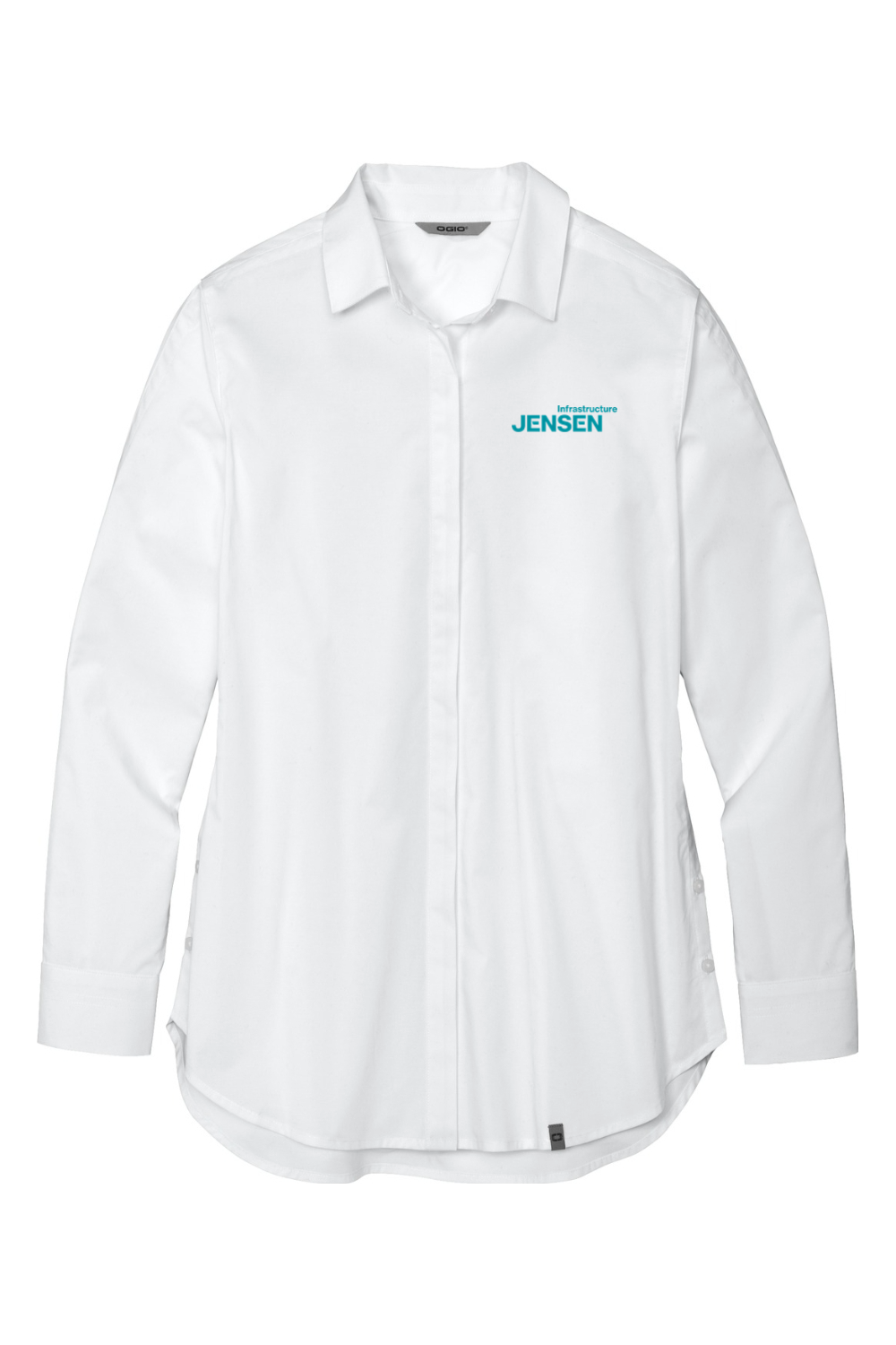 The women’s woven shirt combines style and function with its sleek OGIO design. Designed for mobility and stretch, it features a covered placket with pearlized buttons, top-stitched sleeve seam panels, and adjustable cuffs for a custom fit. The shirt’s side vents and rounded hem enhance comfort, while the DTF logo adds a touch of sophistication. Perfect for both professional and casual settings, this tunic-length shirt offers timeless style with modern comfort.